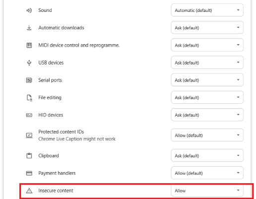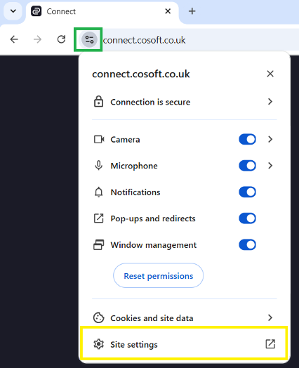 Click the icon to the left of the address to open up a summary of the security and permissions for the site. To edit the full permissions for CONNECT in Chrome, click on the Site Settings link.
