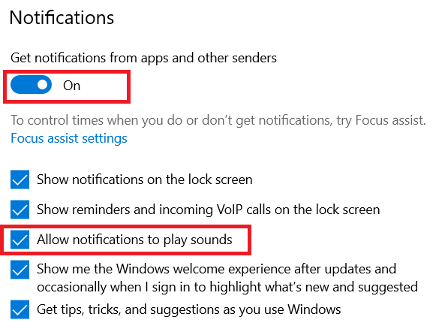 In the top right, click Manage Notifications; this will open the Notification and Actions Settings, ensure Notifications are enabled: