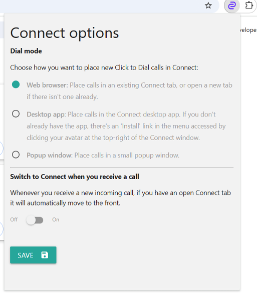 - To allow Connect Application or Browser Window to "pop" to the front on an incoming call
