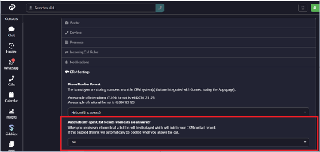 - If you enable this option Connect will pop to the front of the screen automatically when an incoming call rings CONNECT.