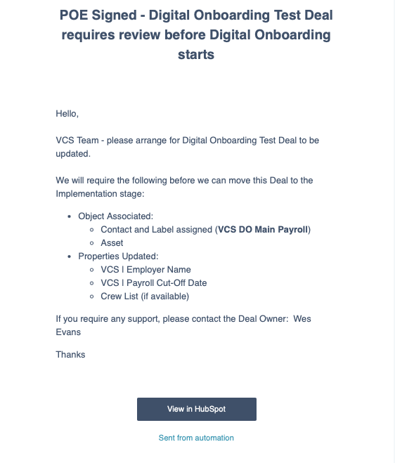 For VCS Deal Types that are either New Business (VCS - DO New) or Cross Sell (VCS - DO workrest), the Deal record must meet the required criteria for a Digital Onboarding record to be created. The criteria will include associations being added to the Deal and properties being updated within the Deal.
