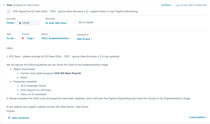 Once the Deal record is moved to the "POE Agreementy Signe" stage, a task will be created, as a final check to make sure that the properties above have been completed. This task will be assigned to the VCS Guernsey Team to complete.