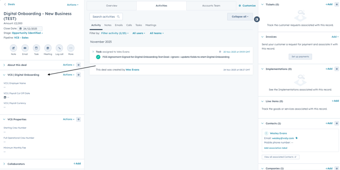 The properties can be found within the Deal, on the VCS | Digital Onboarding card: