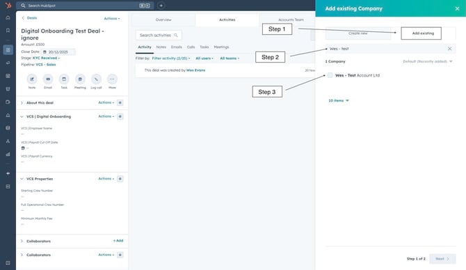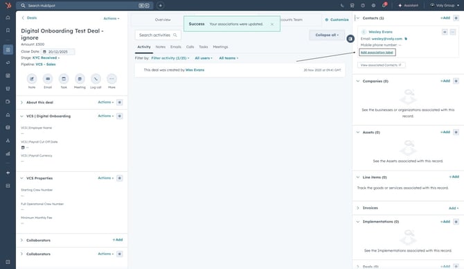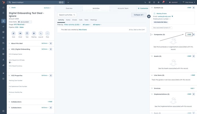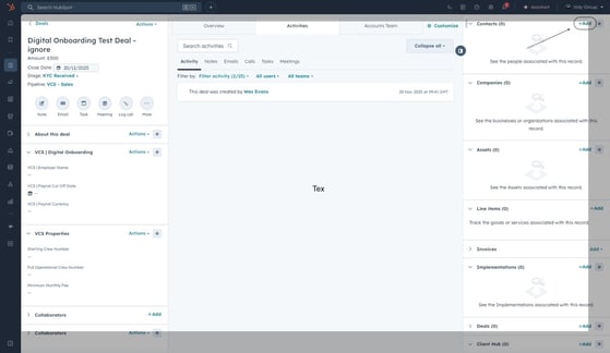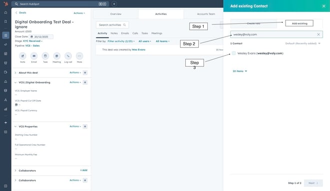 Once we have identified the main contact responsible for Digital Onboarding, we must associate them to the Deal and label them with "VCS Main Pay Roll". Below are the steps on how to do this: